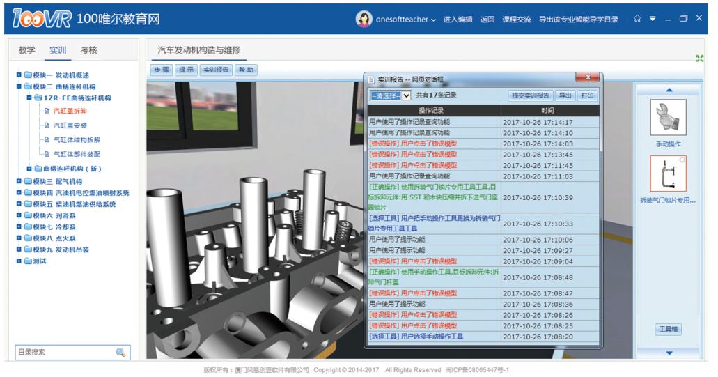 汽修专业系列课程:通过VR仿真技术对德系、日系、美系等汽车各类常见车型的汽车发动机,底盘,电气,空调、电控、车身等各系统结构、原理、拆装、检测、维护与故障排除等42门课程所需要的实验内容(含传统汽车、新能源汽车)进行三维互动模拟仿真,它集教学、实训、考核、备课、授课于一体,并实现多种车型、可实时仿真交互操作的实训教学资源平台,应用三维VR仿真技术培养汽车维修技术人才。