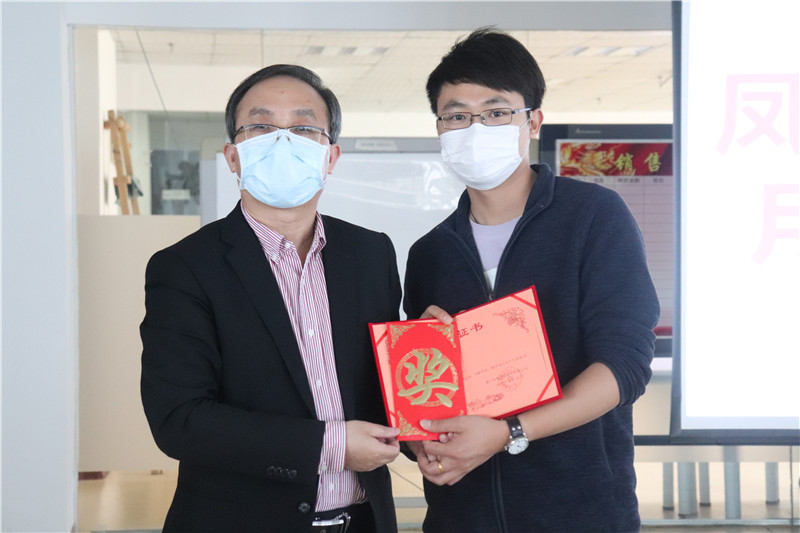 图为林庆平博士为营销中心范绍强同事颁奖
