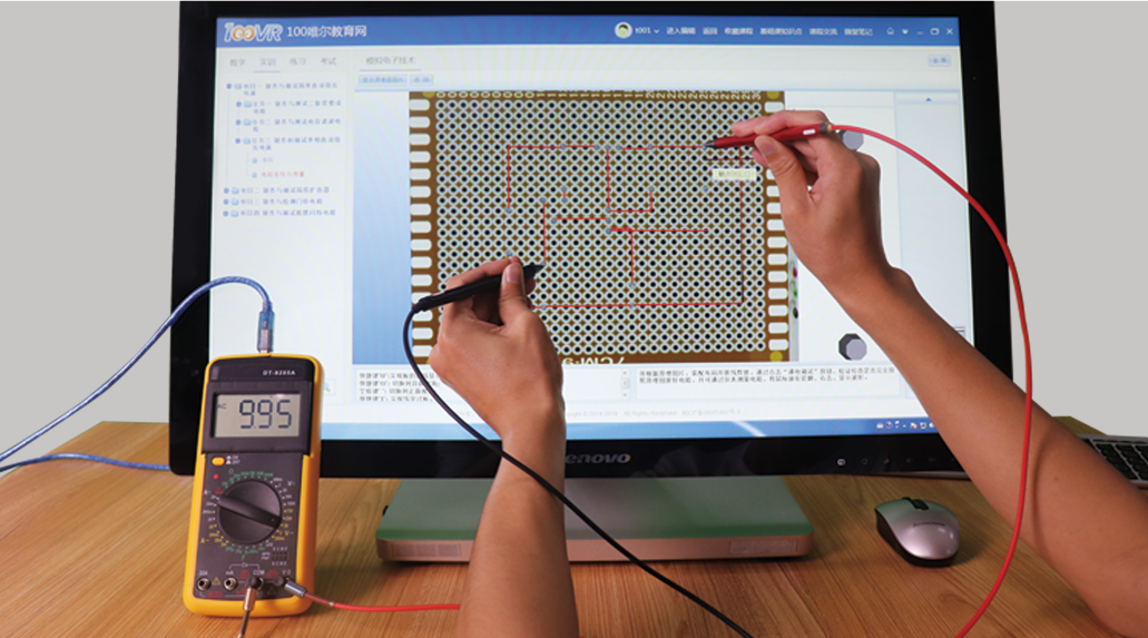 智能万用表在表笔测量触摸显示器上的三维虚拟仿真电路或者电子元器件且档位旋转到合适档位时,测量结果能同步显示在该智能万用表的显示屏上;实际操作测量,完全仿真实际操作体验。