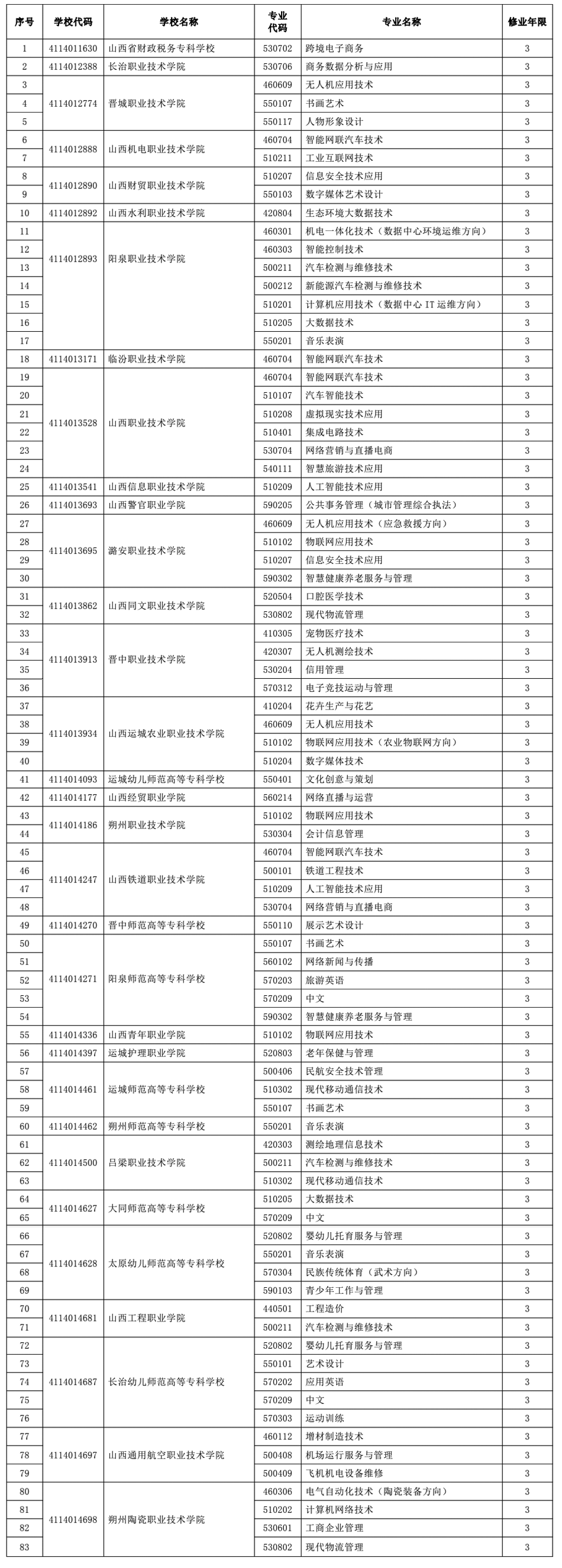 根据《教育部关于公布2022年高等职业教育专科专业设置备案和审批结果的通知》(教职成函〔2022〕1号)精神,我省高等职业教育2022年共新增山西省财政税务专科学校“跨境电子商务”等83个专业点(详见附件1),共撤销山西医科大学“药品经营与管理”等72个专业点(详见附件2),现公布如下。