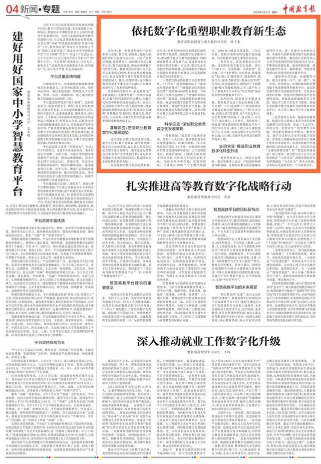 三是用好药,就是要分步推进实施。教育数字化是个复杂的系统工程,不可能“一口气吃成胖子”,必须按照怀进鹏部长提出的“成熟先上”和“分步实施、持续完善”的思路,在“产权无争议,安全有保障”的前提下,甩开膀子、迈出步子、闯出路子、干出样子。我们将分三期建设“国家职业教育智慧教育平台”:2022年3月底,率先上线专业与课程服务中心;6月底,完成其他各中心的开发和上线;12月底,完成平台各规划功能的开发和上线。