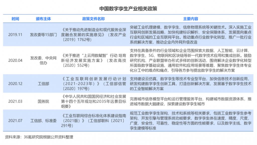 近年来,我国多部委密集出台相关政策,助力数字孪生技术和应用发展。《关于推动先进制造业和现代服务业深度融合发展的实施意见》(发改产业〔2019〕1762 号),提出支持数字孪生技术在工业领域的应用;《关于推进 " 上云用数赋智 " 行动 培育新经济发展实施方案》(发改高技〔2020〕552 号)将数字孪生与大数据、人工智能、5G 等数字技术并列,支持相关行业和企业发展数字孪生技术;《国民经济和社会发展第十四个五年规划和 2035 年远景目标纲要》,将 " 探索建设数字孪生城市 " 纳入加快数字社会建设步伐的重点工作任务。此外,上海、浙江、广东等省市加快启动数字孪生城市建设试点示范,推动数字经济与实体经济深度融合。