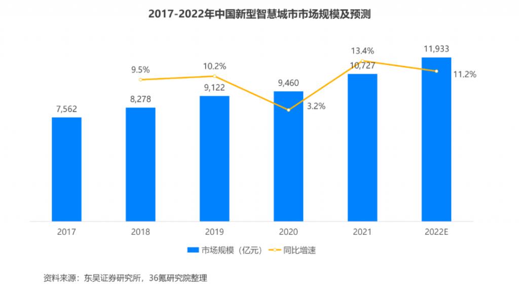 作为实现虚实融合重要的复合技术,数字孪生在各行业的需求日益高涨,目前已被广泛应用于智慧城市、智能制造、智慧医疗等诸多领域。其中,数字孪生在智慧城市中的应用不断拓展深化,主要基于遥感、传感器等技术实现城市全要素数据汇集,构建城市数字孪生体,并运用大数据、人工智能、云计算等技术提高其精确度,最终帮助实现交通、气候环境、仓储物流等社会民生的有效监测及治理。近年来,我国智慧城市市场规模日益扩大,将带动数字孪生的进一步发展。根据东吴证券数据,预计 2022 年中国新型智慧城市市场规模将突破 1.1 万亿元,2020-2022 年 CAGR 为 12.3%。
