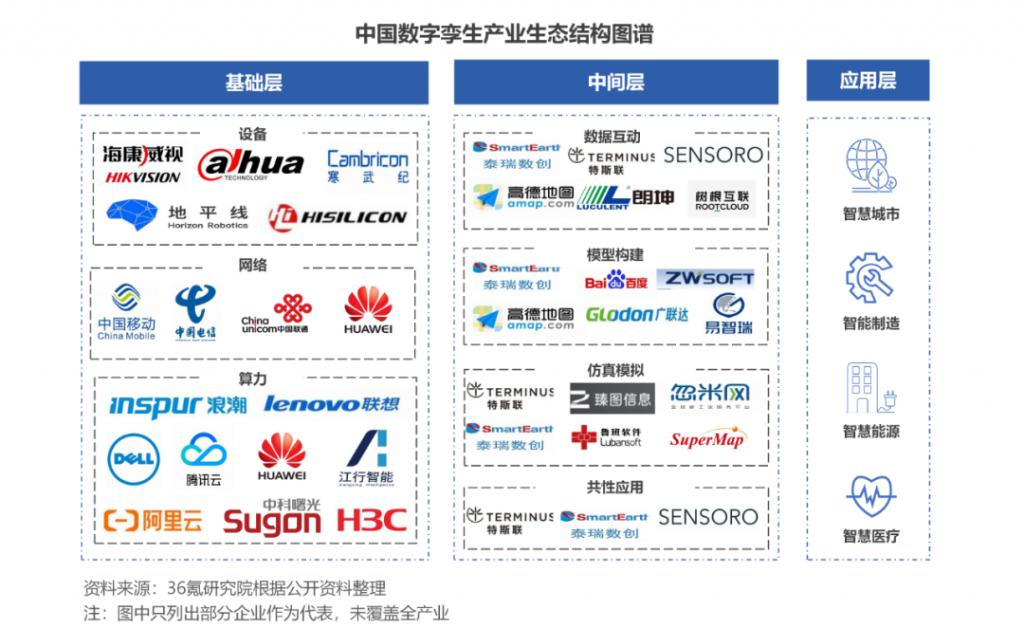 (1)基础层:主要包括芯片、传感器、监控设备等硬件设备以及网络、算力等基础要素,负责数字孪生数据采集和网络发送。目前,传感器领域仍由美、日、德企业主导,中国本土企业市场份额较小;监控设备领域,国产品牌具有一定优势,海康威视作为行业龙头企业,曾提出 " 物信融合 " 的架构体系,引领监控设备智能化转型。(2)中间层:包括数据互动、模型构建、仿真模拟和共性应用。其中,数据互动负责数字孪生的信息采集、传输同步与增强;模型构建提供获取数据和建立数字化模型的服务;仿真模拟是根据物理对象当前状态通过物理规律和机理分析预测未来状态的过程;共性应用则为产品提供全生命周期管理,进行描述、诊断、预测和决策。(3)应用层:包括智慧城市、智能制造、智慧医疗等多方面应用。数字孪生技术具有普适性特点,可在各行业的场景中落地,应用范围不断拓展。