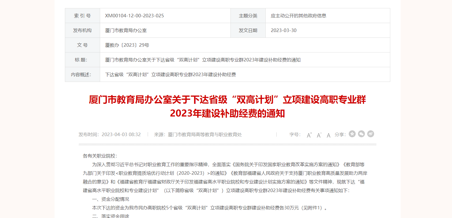 近日,厦门市教育局发布《关于下达省级“双高计划”立项建设高职专业群2023年建设补助经费的通知》,为我市民办高职院校5个省级“双高计划”立项建设高职专业群建设补助经费各30万元。