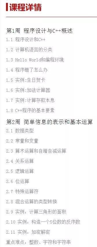 而且这些课程都是系统性的,比如《计算机程序设计(C++)》,它的目录是这样的↓↓