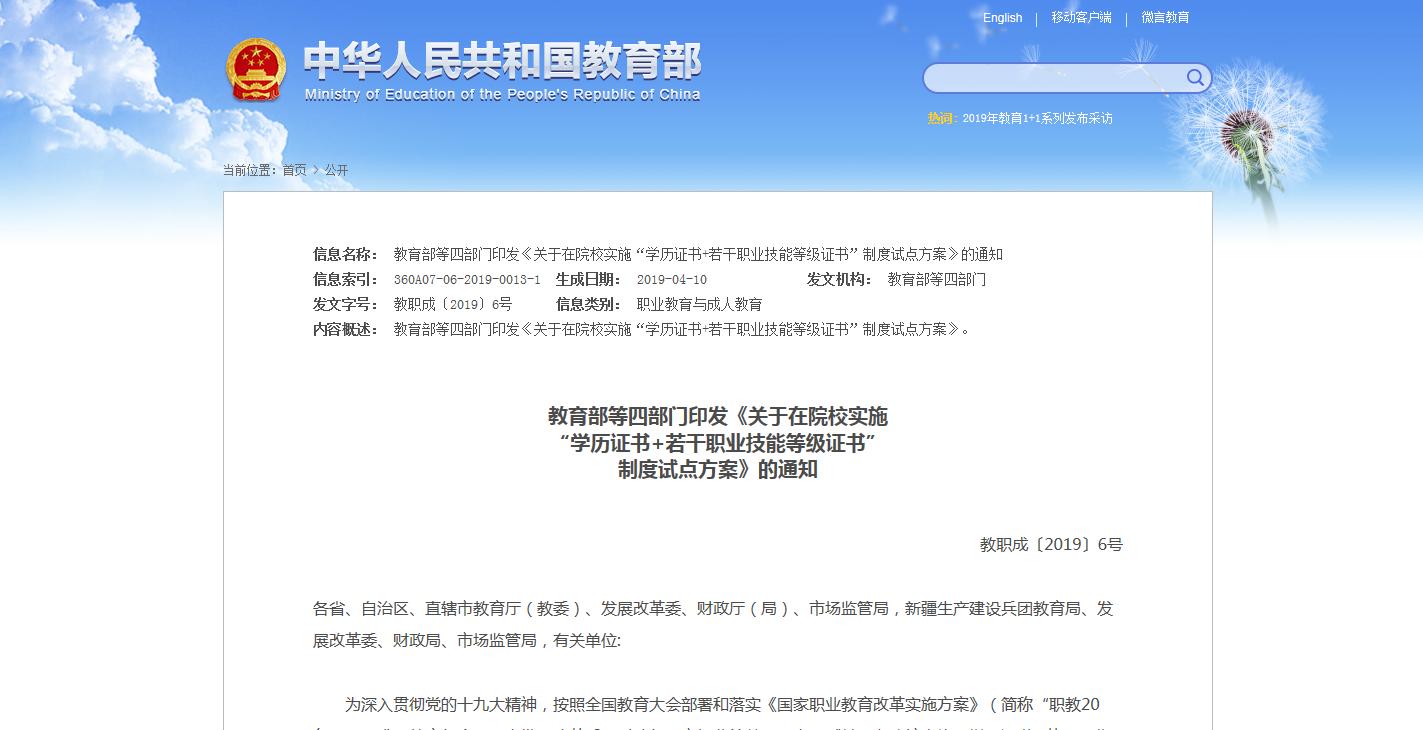 2019年,职业教育的‘一盘大棋’正在推进,改革逐步进行。近日,教育部等四部门印发《关于在院校实施“学历证书+若干职业技能等级证书”制度试点方案》的通知,对国务院印发的《国家职业教育改革实施方案》中提到的1+X证书制度,提出了目标要求,和具体的执行细则。