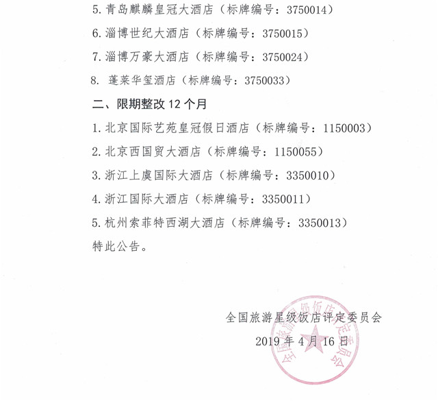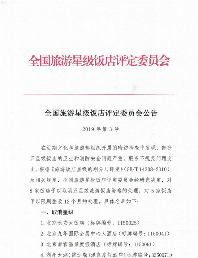 4月18日,在中国旅游饭店协会官网星评公告栏中全国旅游星级饭店评定委员会发布2019年第3号公告,称因卫生和消防安全问题严重,服务不规范问题突出,8家饭店被取消五星级旅游饭店资格,5家饭店被要求限期整改12个月。