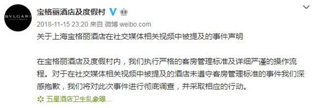 11月14日晚间,网友“花总丢了金箍棒”在微博发出重磅视频,曝光众多五星级酒店严重卫生问题,涉及上海的共有7家酒店。15日晚间,上海宝格丽酒店回应称,对于在社交媒体相关视频中被提及的酒店未遵守客房管理标准的事件我们深感抱歉,我们将对此次事件进行彻底调查,并采取相应的行动。