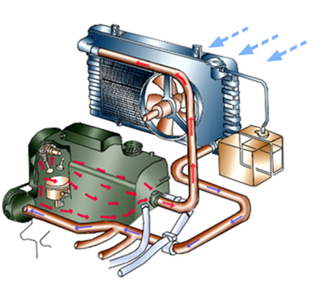 冷却系的功用是将受热零件吸收的部分热量及时散发出去,保证发动机在最适宜的温度状态下工作。水冷发动机的冷却系通常由冷却水套、水泵、风扇、水箱、节温器等组成。