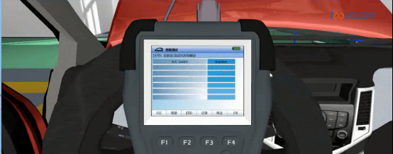 启动发动机,打开空调,转速保持在1500-2000转/分运转,温度调到最冷,风速最大,风向出向正面,诊断空调是否制冷。