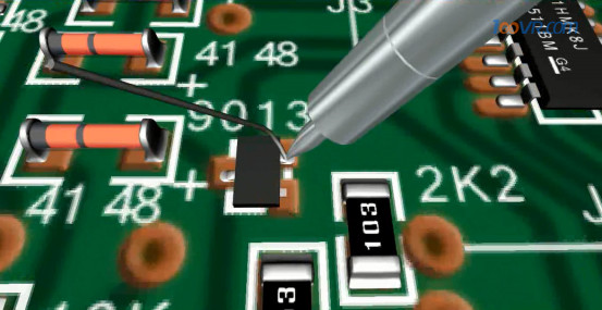 1. 定位,先用电烙铁熔一点焊锡到其中一个焊点上,再用镊子夹取三极管放置在焊点上。