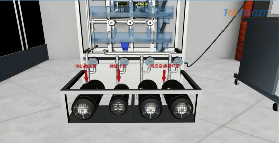 对象系统由4台不同功率的水泵机组组成,功能上划分为常规变频循环泵(2台)、消防增压泵(1台)、休眠小泵(1台),分别用于模拟正常模式下的生活供水系统和夜间小流量的生活供水动力系统以及消防水动力系统。