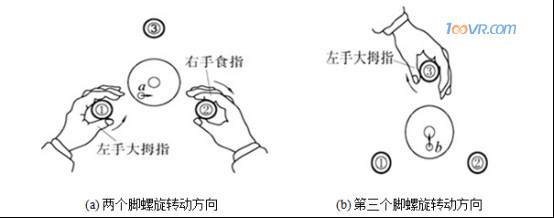 粗略整平是借助圆水准器的气泡居中,使仪器竖轴大致铅直,从而视准轴粗略水平。如图a所示,气泡未居中而位于a处,则先按箭头所指方向,用双手相对转动脚螺旋①、②,使气泡移动到b的位置,如图b所示。再左手转动脚螺旋③,即可使气泡居中。在整平的过程中气泡移动的方向与左手大拇指运动的方向一致。