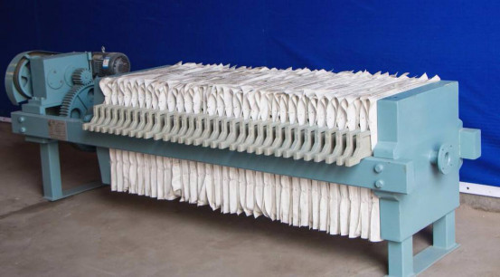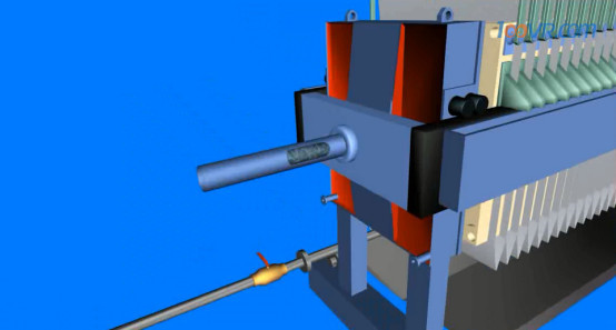 油缸推动压紧板,压紧各个滤板。此时,滤板与滤板之间就形成了滤室。