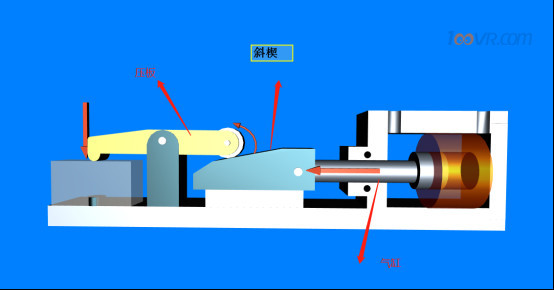 气缸向左推动斜楔运动,滚子按箭头方向进行旋转,推动压板向下压紧工件。