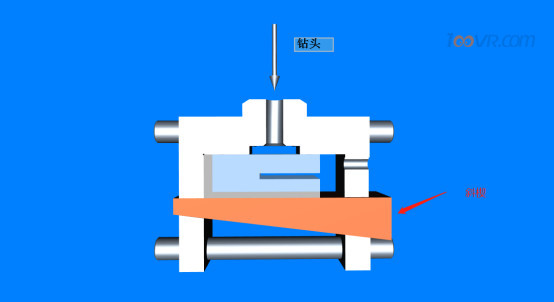 斜楔由右向左插入,楔紧工件,钻头旋转运动通过钻套加工工件内孔。
