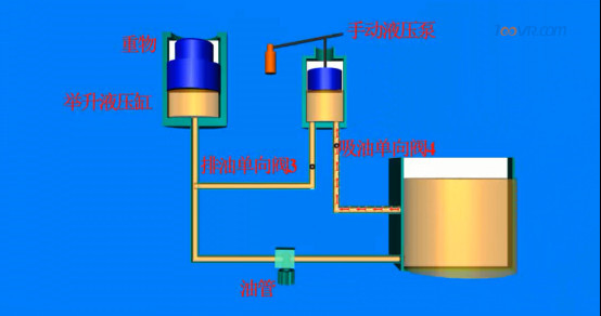 2.压油和重物的举起:压下杠杆手柄,由于单向阀此时处于关闭状态,油体不会向油箱回流。由于液体压力,使得单向阀开启,油体通过油管进入液压缸,将重物举起。此时放油阀处于关闭状态。