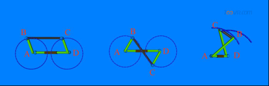 铰链四杆机构是平面四杆机构的基本型式,其他型式的四杆机构可以认为是它的演化型式。在此机构中AD为机架、AB/CD两杆与机架相连称为连架杆,BC为连杆。而在连架杆中,能作整周回转者称为曲柄只能在一定范围内摆动者称为摇杆。