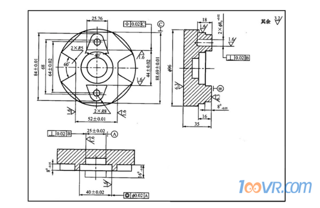 八边形凹凸件主要由八边形外形轮廓、凹槽及孔系组成。其中八边形侧边、钻孔凸台两对应边、凹槽两对应边、工件中心两同心圆孔内壁、φ8内孔的表面粗糙度要求较高,Ra为1.6μm,工件底部与钻孔凸台上表面粗糙度要求较低,Ra为6.3;其余表面的粗糙度要求为3.2μm ;φ25±0.01孔对B、2³φ8孔对B面有垂直度要求;钻孔凸台两内侧边对c面有对称要求。零件外形轮廓尺寸公差要求高。