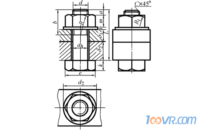 螺栓用于两个或两个以上不太厚并能钻成通孔的零件之间的连接。为了便于装配,通孔直径比螺纹直接略大,螺栓连接通常采用比例画法。