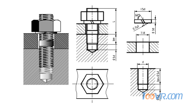 双头螺柱连接由双头螺柱、螺母、垫圈组成。当两个被连接件有一个很厚,或者不适合用螺栓连接时,常用双头螺柱连接。双头螺柱两端均加工有螺纹,一端与被连接件旋合,另一端与螺母旋合。