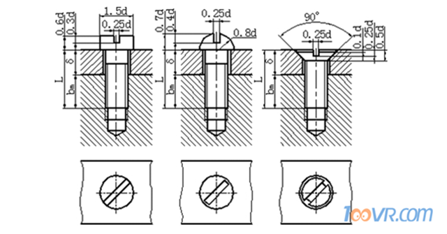 2.具有沟槽的螺钉头部,在主视图中应被放正,在俯视图中规定画成45°倾斜。