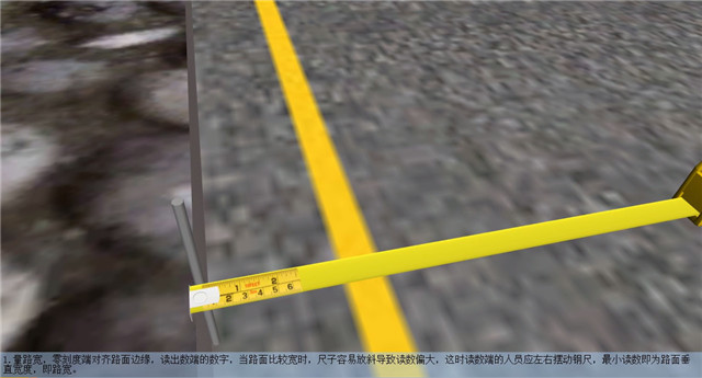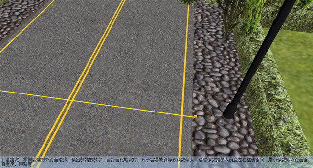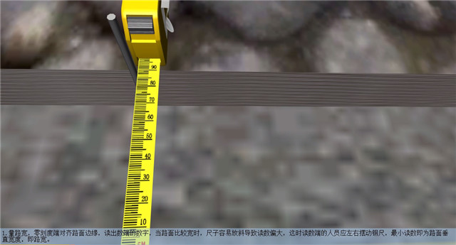 1.找路宽方向:零刻度端对齐路面边缘,读出数端的数字,当路面比较宽时,尺子容易放斜导致读数偏大,这时读数端人员应左右摆动拉直钢尺,读数最小时为垂直方向,此时读数即为路宽。