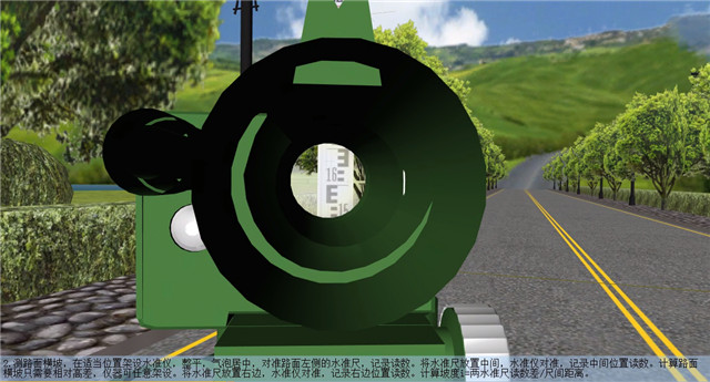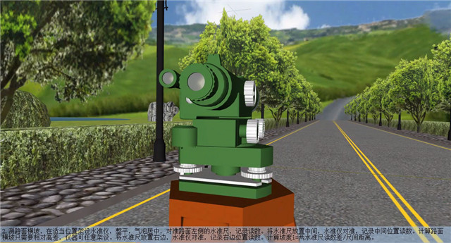2. 整平,气泡居中,对准路面上左侧的水准尺,记录读数。将水准尺放置中间,水准仪对准,记录中间位置读数。计算路面横坡只需要相对高差,仪器可任意架设。将水准尺放置右边,水准仪对准,记录右边位置读数。计算坡度i=两水准尺读数差/尺间距离。