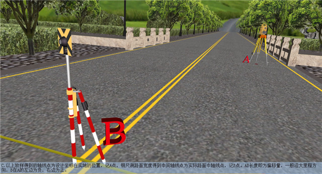 以上放样得到的轴线点为设计坐标在实地的位置,记A点,钢尺测路面宽度得到中间轴线点为实际路面中轴线点,记B点。AB长度即为偏移量,一般沿大里程方向,B在A的左边为负,右边为正。
