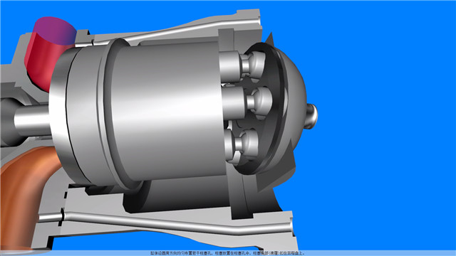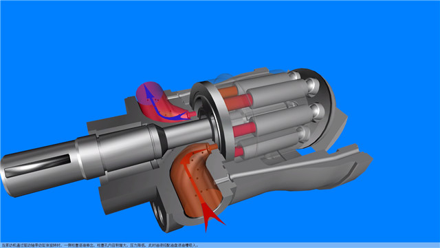 柱塞泵是往复泵的一种,属于体积泵,其柱塞靠泵轴的偏心转动驱动,往复运动,其吸入和排出阀都是单向阀。当柱塞外拉时,工作室内压力降低,出口阀关闭,低于进口压力时,进口阀打开,液体进入;柱塞内推时,工作室压力升高,进口阀关闭,高于出口压力时,出口阀打开,液体排出。当传动轴带动缸体旋转时,斜盘将柱塞从缸体中拉出或推回,完成吸排油过程。柱塞与缸孔组成的工作容腔中的油液通过配油盘分别与泵的吸、排油腔相通。变量机构用来改变斜盘的倾角,通过调节斜盘的倾角可改变泵的排量。