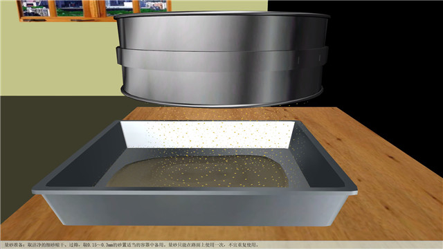 1.量砂准备:取洁净的细砂,晾干过筛,取0.15-0.3mm的砂置适当容器中备用,量砂只能在路面上使用一次,不宜重复使用。