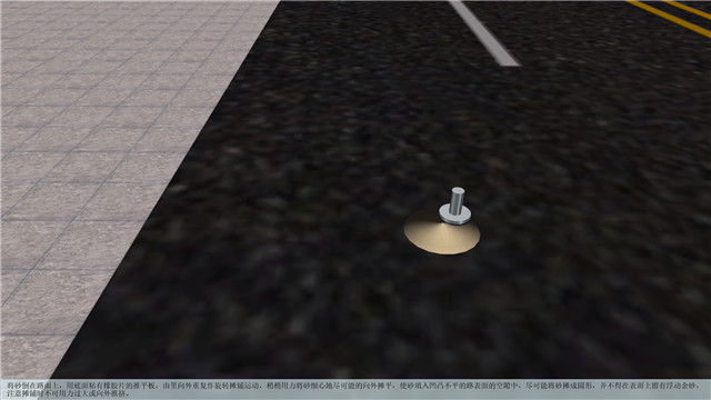 3.将砂倒在路面上,用底面粘有橡胶片的推平板,由里向外重复作旋转摊铺运动,稍稍用力将砂细心地尽可能地向外摊开,使砂填入凹凸不平的路表面的空隙中,尽可能将砂摊成圆形,并不得在表面上留有浮动余砂。注意摊铺时不可用力过大或向外推挤。
