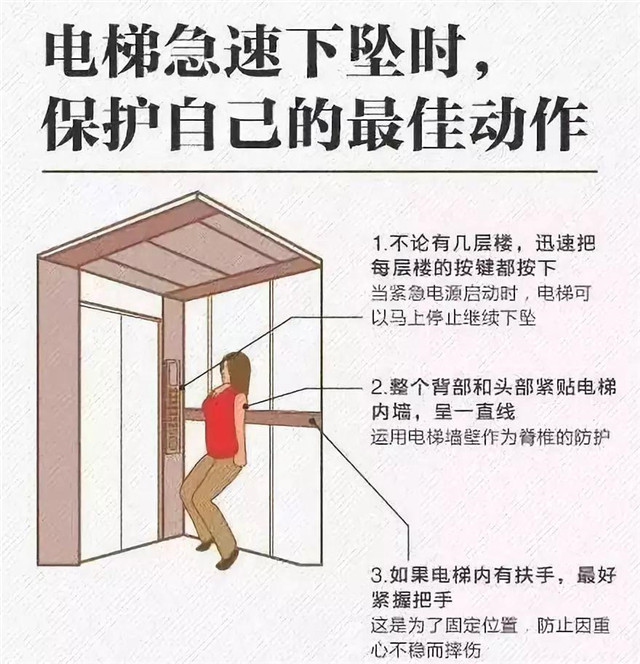 整个背部和头部紧贴在电梯内墙上,呈一条直线,应用电梯墙壁作为脊椎的防护。两臂张开,扶住扶手或内墙,固定位置,防止因重心不稳而摔伤。