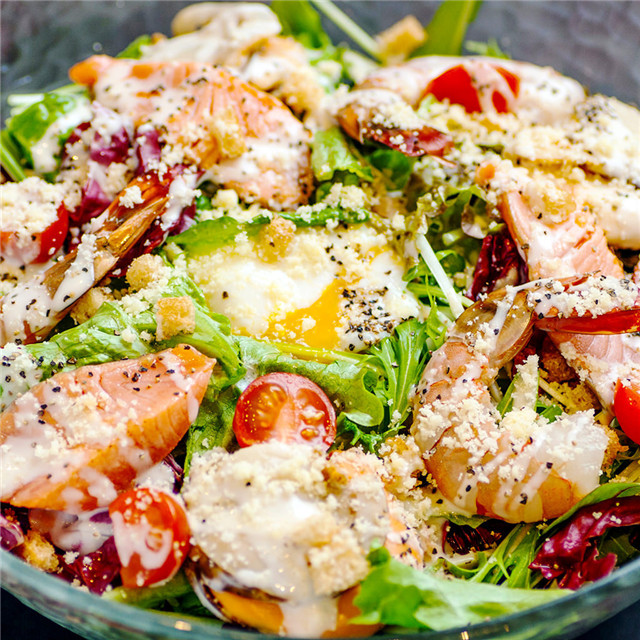 沙拉并不只是一堆冷冰冰的蔬菜,还可以包括各种高蛋白的肉类,以及面包丁、通心粉等主食。凯撒沙拉就是其中著名的一种,传统风味中除了蔬菜、肉类和奶酪外,还配有煎烤过的面包丁以提供饱腹感。