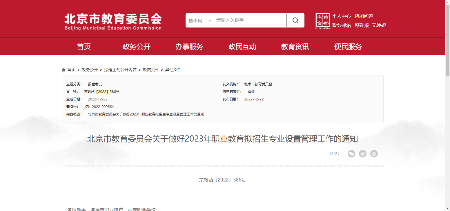 北京市教委发布《关于做好2023年职业教育拟招生专业设置管理工作的通知》
