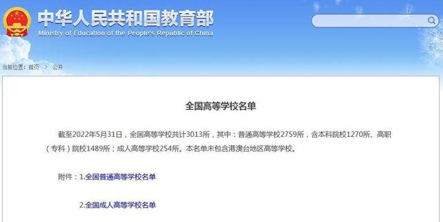 截至2022年5月31日,全国高等学校共计3013所,其中:普通高等学校2759所,含本科院校1270所、高职(专科)院校1489所;成人高等学校254所。本名单未包含港澳台地区高等学校
