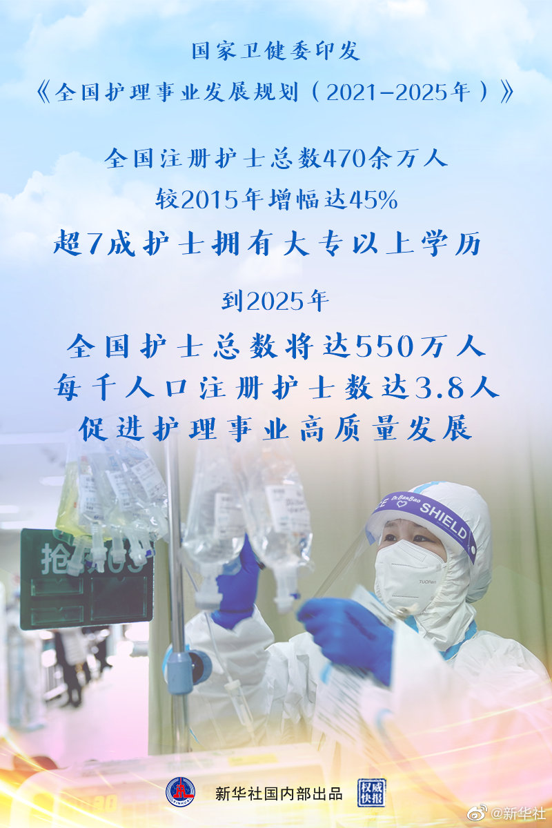 国家卫健委近日印发《全国护理事业发展规划(2021-2025年)》。规划指出,2020年底,全国注册护士总数470余万人,较2015年增幅达45%。具有大专以上学历的护士超70%,护士队伍学历素质进一......